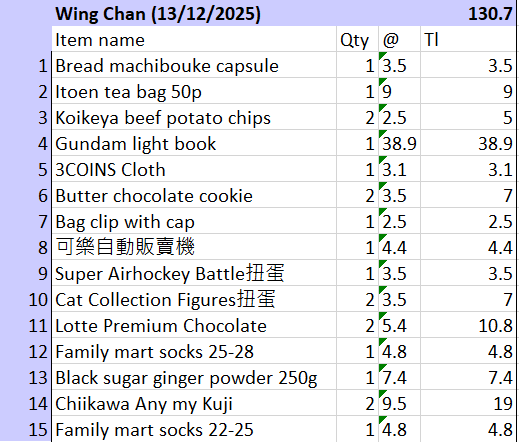 | 2 | Itoen tea bag 50p | 1 | 9 | 9 |